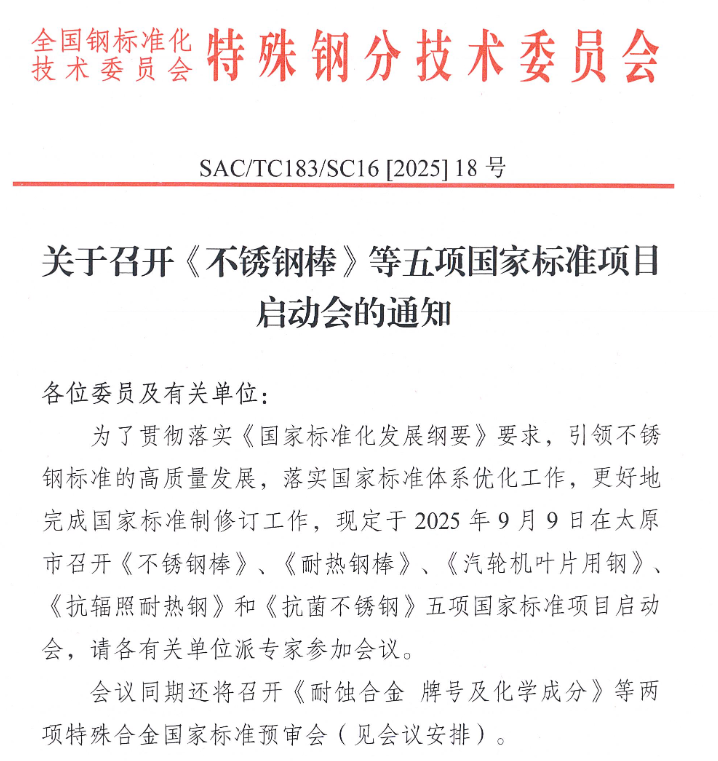2025年9月9日,《不銹鋼棒》、《耐熱鋼棒》、《汽輪機(jī)葉片用鋼》、《抗輻照耐熱鋼》和《抗菌不銹鋼》五項(xiàng)國家標(biāo)準(zhǔn)項(xiàng)目啟動(dòng)會(huì)將于太原市召開。