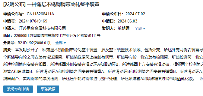 2024年7月2日,江蘇甬金金屬科技有限公司成功申請(qǐng)一項(xiàng)名為“一種薄層不銹鋼鋼帶冷軋整平裝置”專利,申請(qǐng)公布號(hào)CN118268411A,申請(qǐng)日期為2024年6月3日。