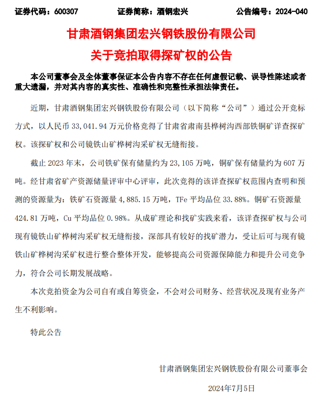 7月5日,據(jù)酒鋼宏興公告稱,公司近期通過公開競標(biāo)方式,以人民幣 33,041.94 萬元價格競得了甘肅省肅南縣樺樹溝西部鐵銅礦詳查探礦權(quán)。