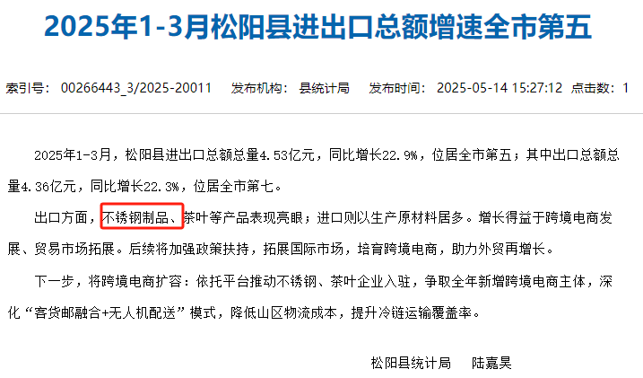 2025年5月14日,松陽縣統(tǒng)計局發(fā)布一文《2025年1-3月松陽縣進出口總額增速全市第五》。