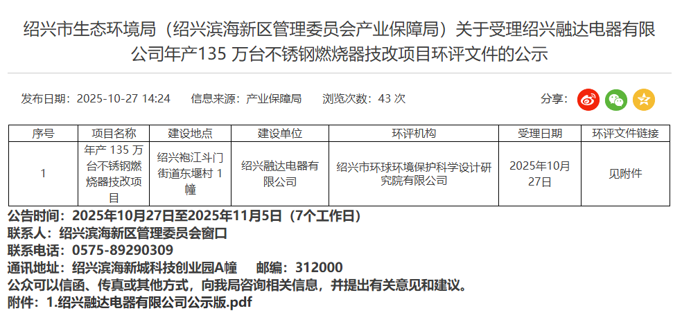 2025年10月27日,紹興市生態環境局受理紹興融達電器有限公司年產135萬臺不銹鋼燃燒器技改項目環評文件并對外進行公示,公示時間:2025年10月27日至2025年11月5日(7個工作日)。
